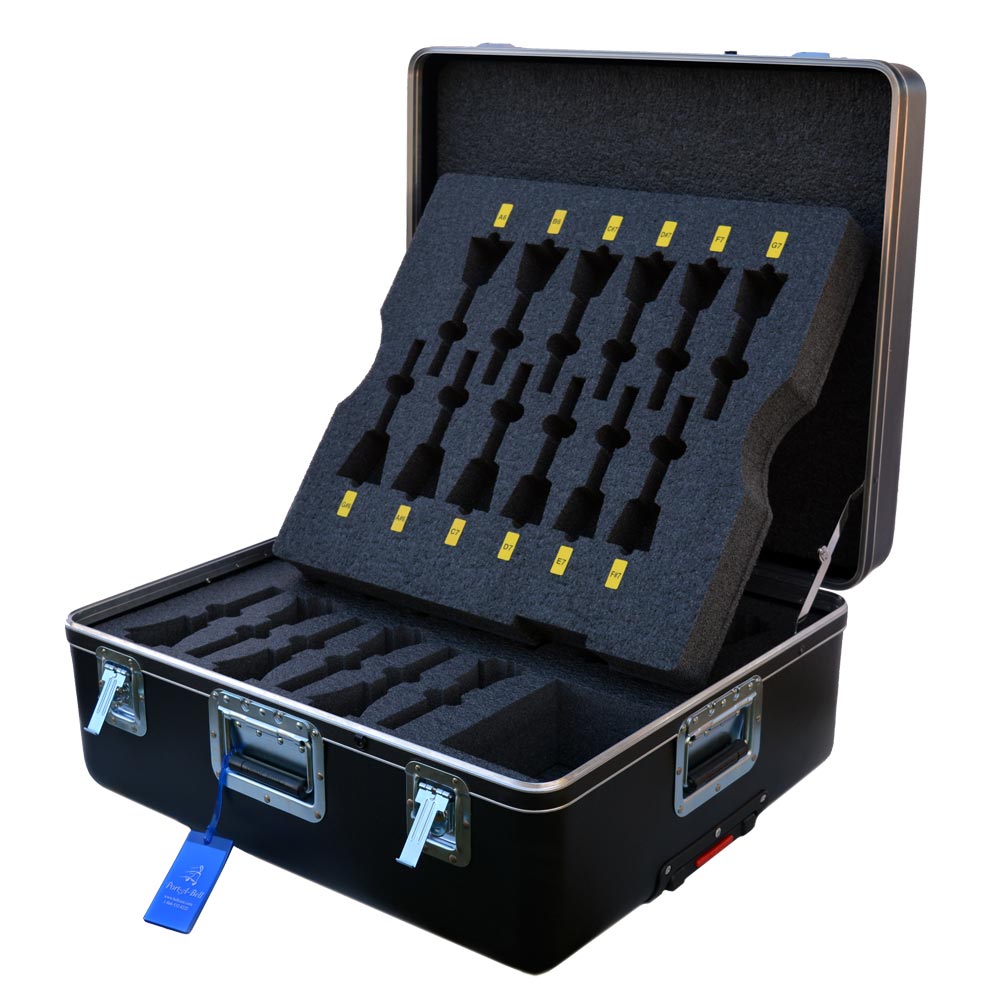 As shown on the pictures here, the flight cases are of high quality, and the slots are specifically designed to fit our set of Whitechapel Bells, with the appropriate sized mouldings inside the robust cases. They are also fitted with wheels and have modern flight case security closures and sprung grab-handles.