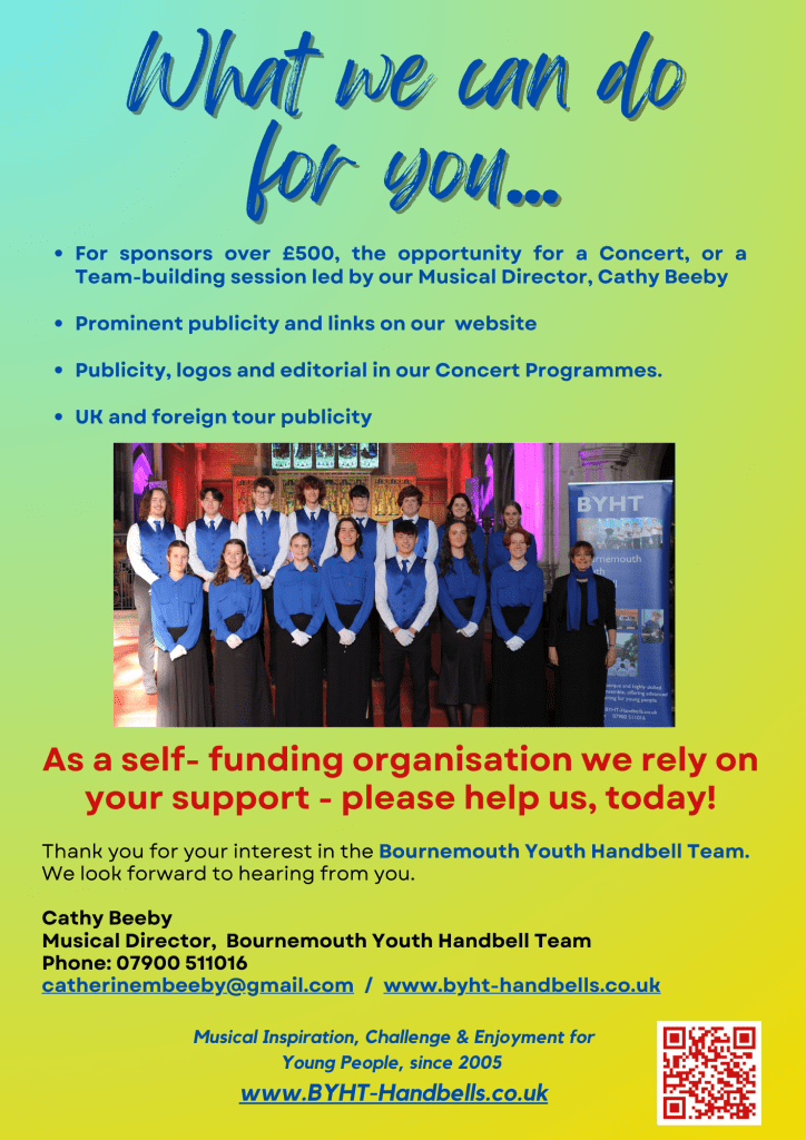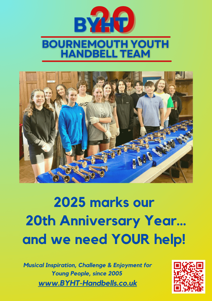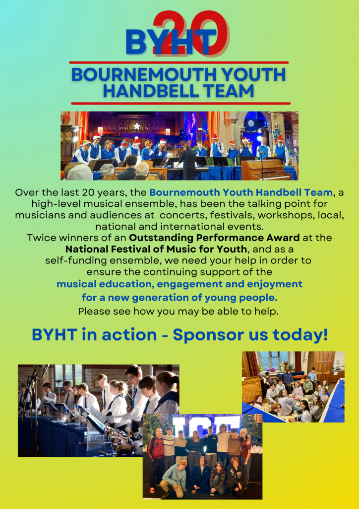 The Bournemouth Youth Handbell Team is entirely self-funded, relying on donations, income from sales of CD’s, fees from Concerts and Events, etc, to fund the training for our young musicians.